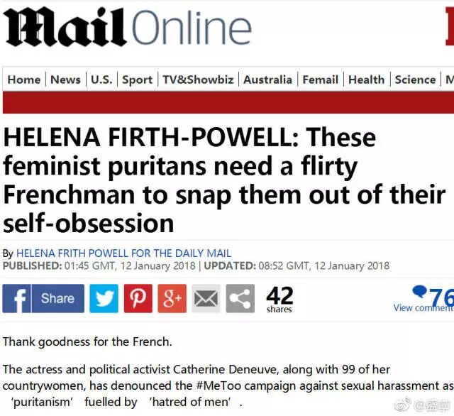 而在金球獎頒獎之後不到一周,法國《世界報》發表了一封公開信,公開質疑#Me too運動。這封公開信有100名有影響力的女性署名,其中不乏像凱瑟琳·德納芙這樣的法國國寶級的老牌女星。